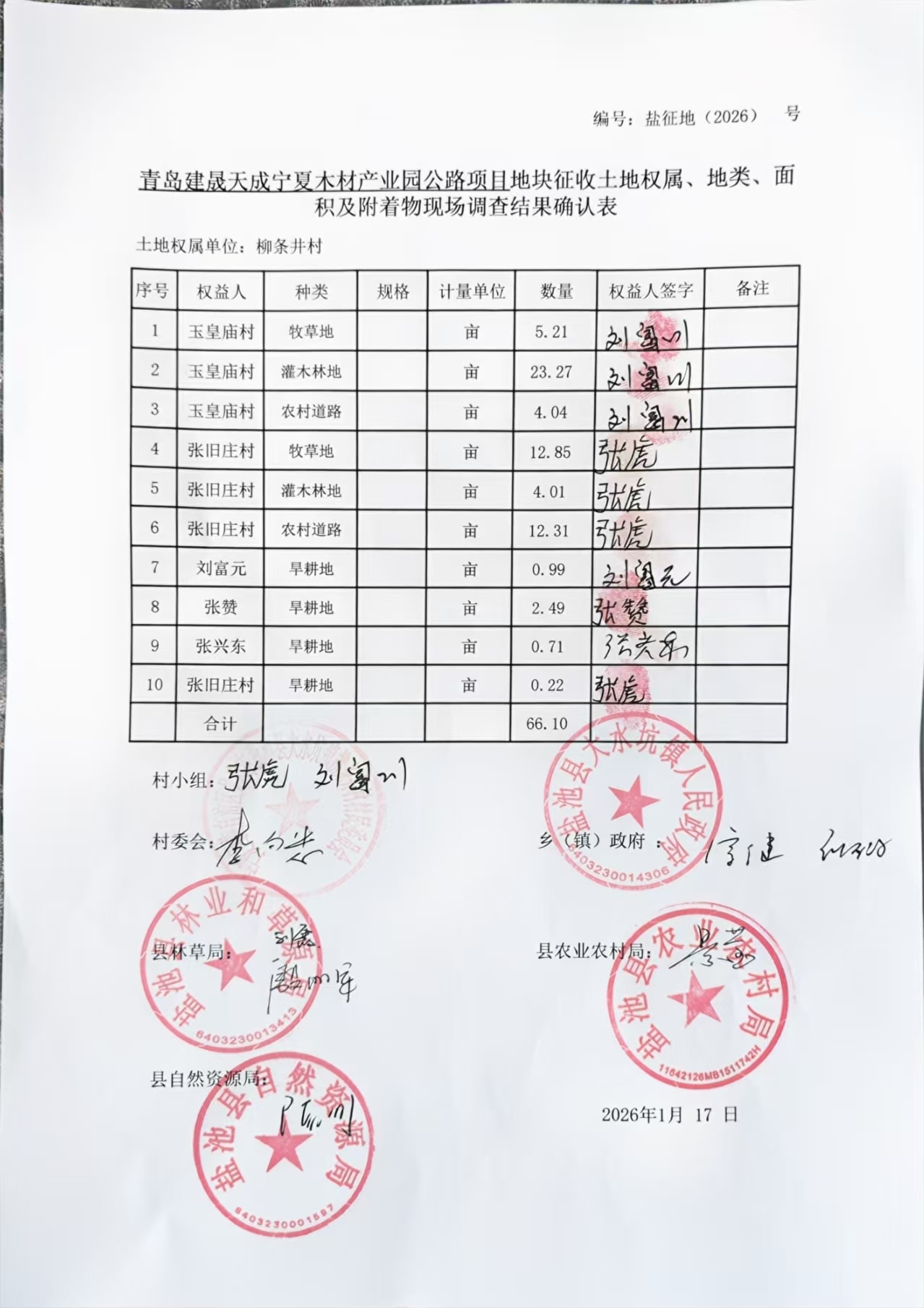 附件:青岛建晟天成宁夏木材产业园公路项目征收土地及附着物权属、地类、面积现场调查结果确认表