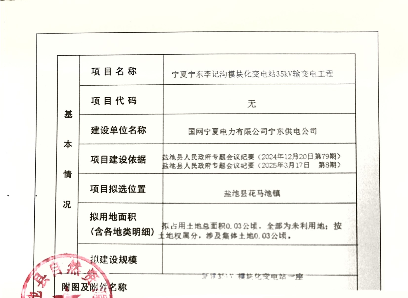 标 题: 宁夏宁东李记沟模块化变电站35kV输变电工程建设项目用地预审与选址意见书