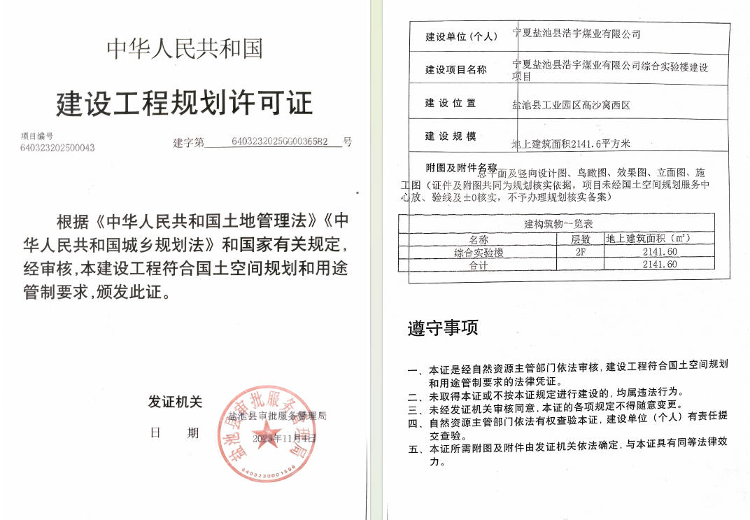 宁夏盐池县浩宇煤业有限公司综合实验楼建设项目(工程规划许可证)