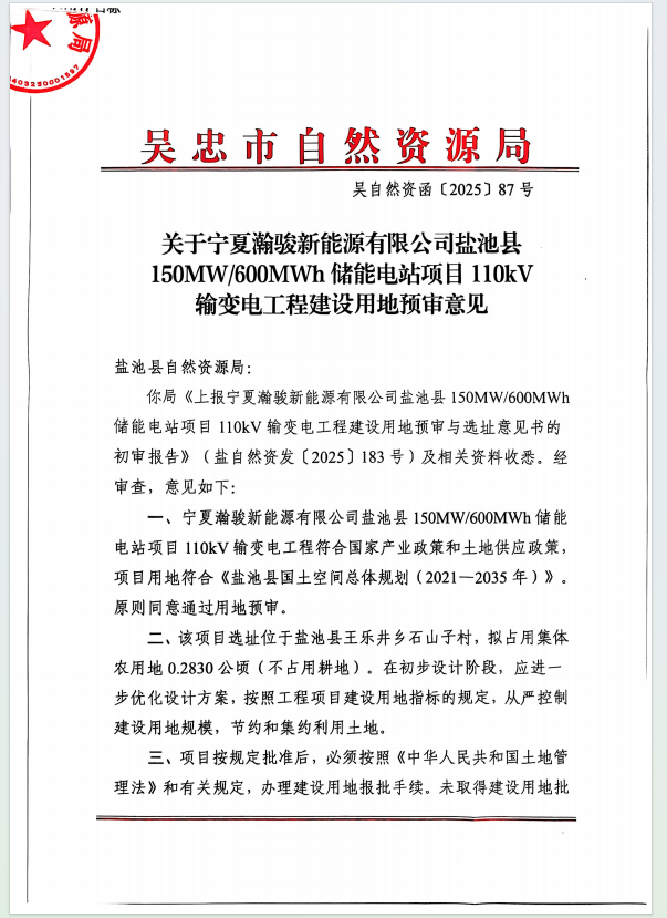 宁夏瀚骏新能源有限公司盐池县150MW600MWh储能电站项目110kV输变电工程预审与选址意见书