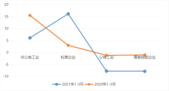 (四)分经济类型看,1-3月,全县非公有制工业增长6.09%,增幅较上年同期下降了9.41个百分点;私营企业增长16.13%,增幅较上年同期下降了13.13个百分点;公有工业下降7.76%,降幅较上同期提高了5.56个百分点;国有控股企业下降7.84%,降幅较上年同期扩大了6.84个百分点。