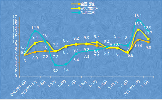 2022年—2023年全区、吴忠市、盐池县增加值增速对比图