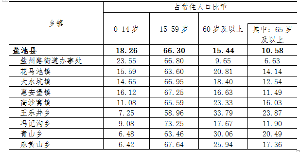 各乡镇常住人口中,15-59岁人口比重在65%以上的有6个,在60%-65%之间的乡镇有2个,在60%以下的乡镇有1个。8个乡镇65岁及以上老年人口比重超过7%。