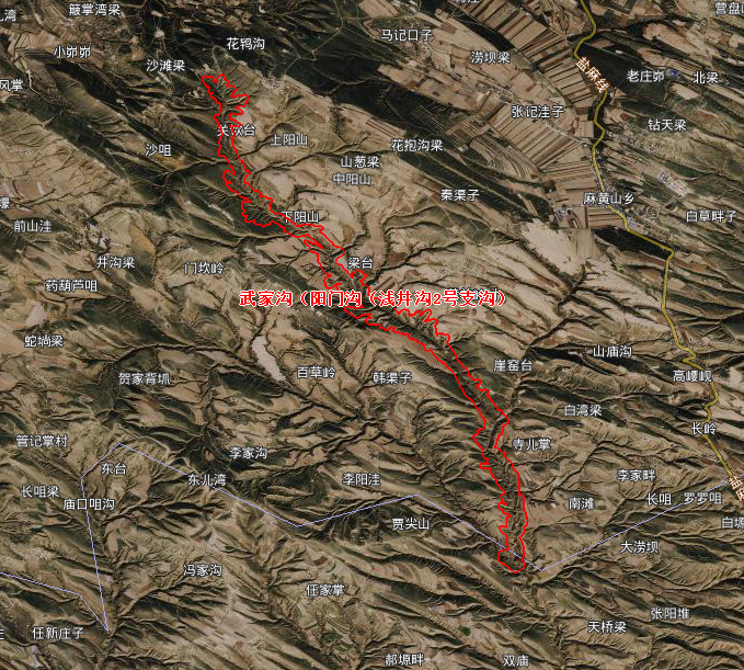 武家沟(浅井2支沟阳门沟)位于我县麻黄山乡境内,河道全长10.64公里,由西北向东南方向流经3个行政村,起点为麻黄山乡何新庄行政村白记洼子自然村,流经黄羊岭行政村、下高窑行政村、黄羊岭行政村,终点为黄羊岭行政村李记畔自然村。