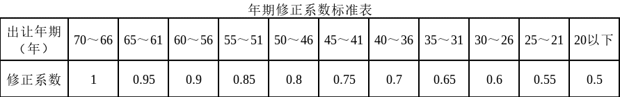 使用权保持相同的截止日。年期修正系数标准见下表: